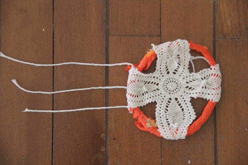 3. Attach the doily to the ring by weaving it around the sides using string.